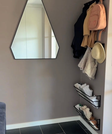 - Montera flera skohyllor ovanpå varandra och skapa en vägghängd skohylla.