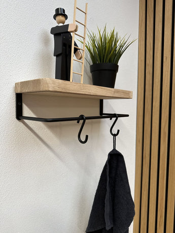 Multifunktionell hylla kombinerar elegant design med praktiska egenskaper. Ekskivan kan placeras på antingen den övre eller nedre galgen, beroende på dina behov, och har ett spår som passar galgens form. Denna flexibilitet gör hyllan idealisk för förvaring av kaffekoppar, parfymer eller som en praktisk lösning i hallen för nycklar och väskor. Krokarna kan köpas separat. Köp träolja och skydda träet. (1 x 20 ml (1 flaska) behövs)