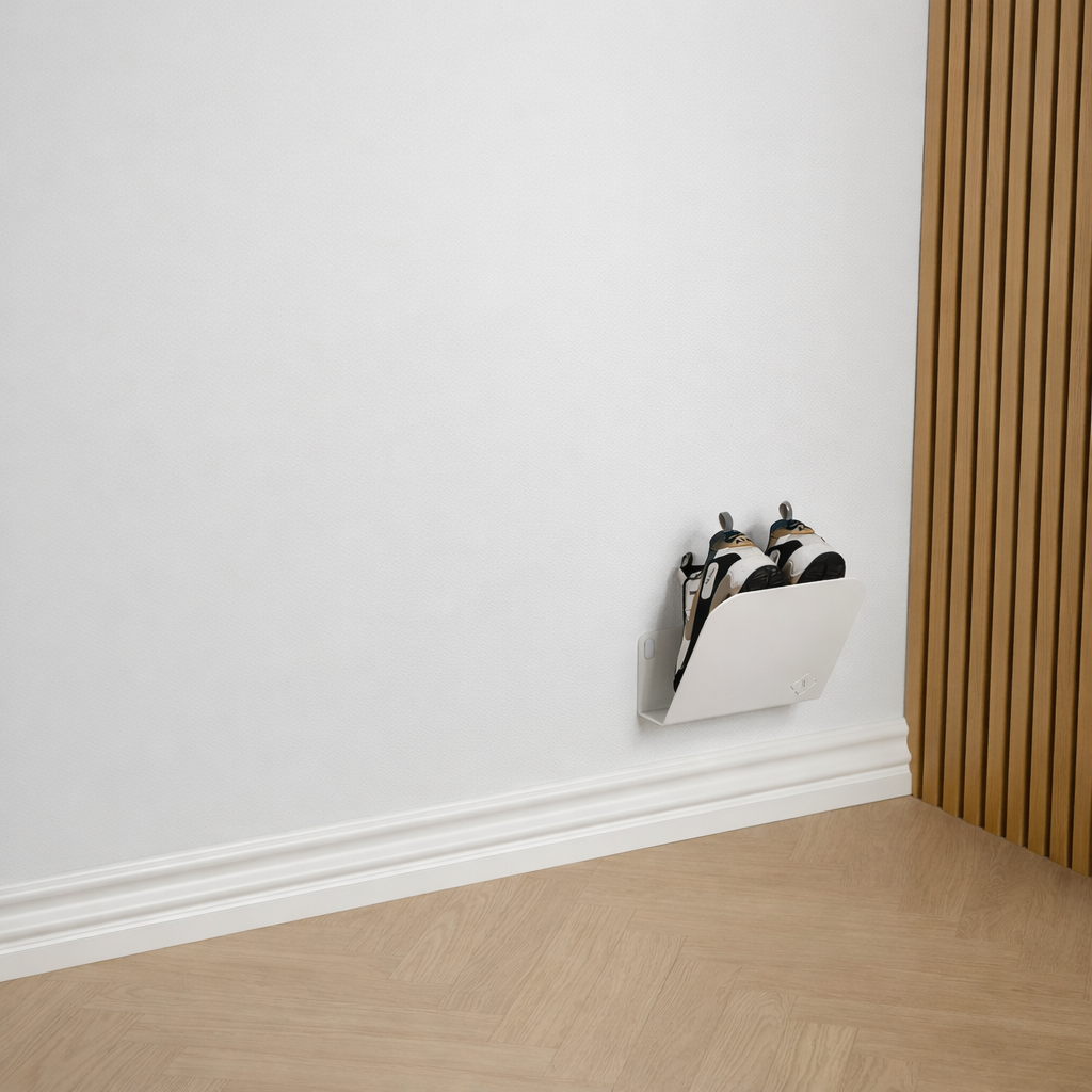 Skohyllan är utformad med en diskret böjning mot väggen, vilket har en praktisk funktion: skornas tår slår inte mot väggen, utan vilar istället på den böjda ytan. Detta skyddar både väggen och skorna och ger samtidigt ett prydligare och svävande utseende.