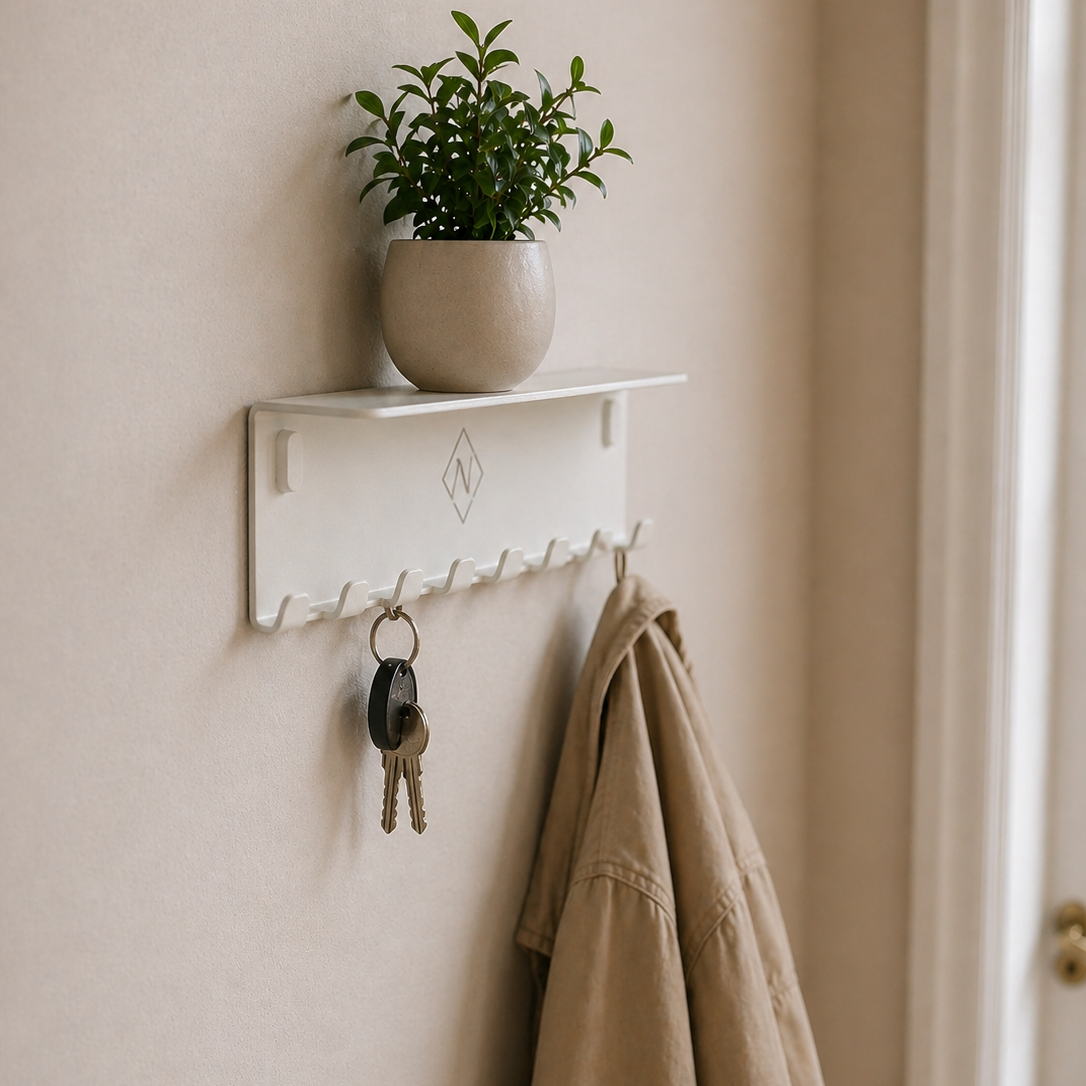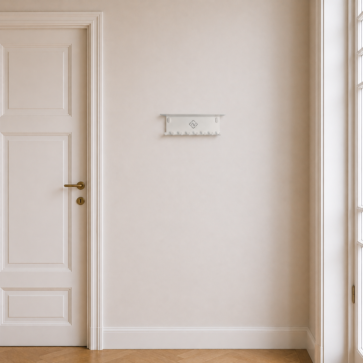Knagen er udstyret med en række af 8 kroge, som gør det nemt at organisere alt fra jakker og håndklæder til viskestykker, smykker eller din føntørrer. Den integrerede hylde giver ekstra plads til de ting, du gerne vil have lige ved hånden – hvad enten det er krydderier i køkkenet, parfumer på badeværelset eller pung, solbriller og små pyntegenstande i entréen. Nem at montere – skruer og universal rawlplugs medfølger.